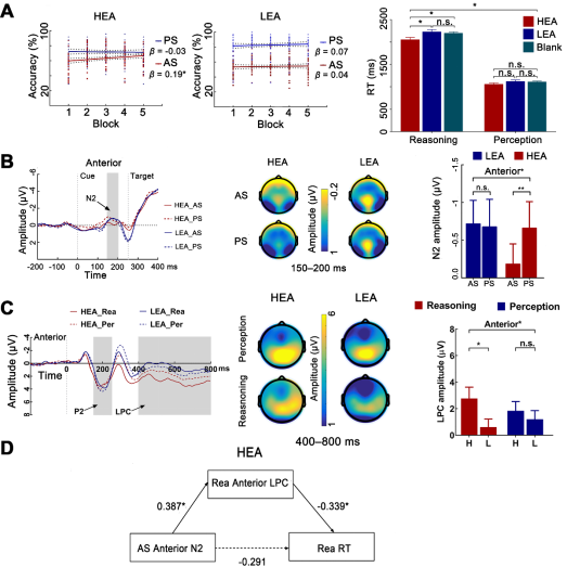 行为结果显示,仅在HEA组中,AS试次正确率随着block数量的增加而上升,说明HEA组被试在反眼跳任务中有意识地努力完成好AS试次,该类试次产生了训练效应,最终增强了被试执行注意;而LEA组被试执行注意未受反眼跳任务影响(图2A)。在后续的测验任务中,HEA组仅在完成类比推理任务时反应时快于LEA组以及空白对照组,但在知觉匹配任务上三组无显著差异(图2A)。在ERP结果中,首先发现HEA组中AS试次前额区(Fz, F1-F4)N2波幅显著小于PS试次,而在LEA组中没有这样的结果(图2B)。此外,HEA组仅在关系推理任务中前额区晚期正成分(LPC)波幅显著大于LEA组(图2C),并且研究进一步发现在HEA组中,关系推理任务中前额区LPC可中介AS前额区N2与关系推理反应时之间的关系(图2D)。