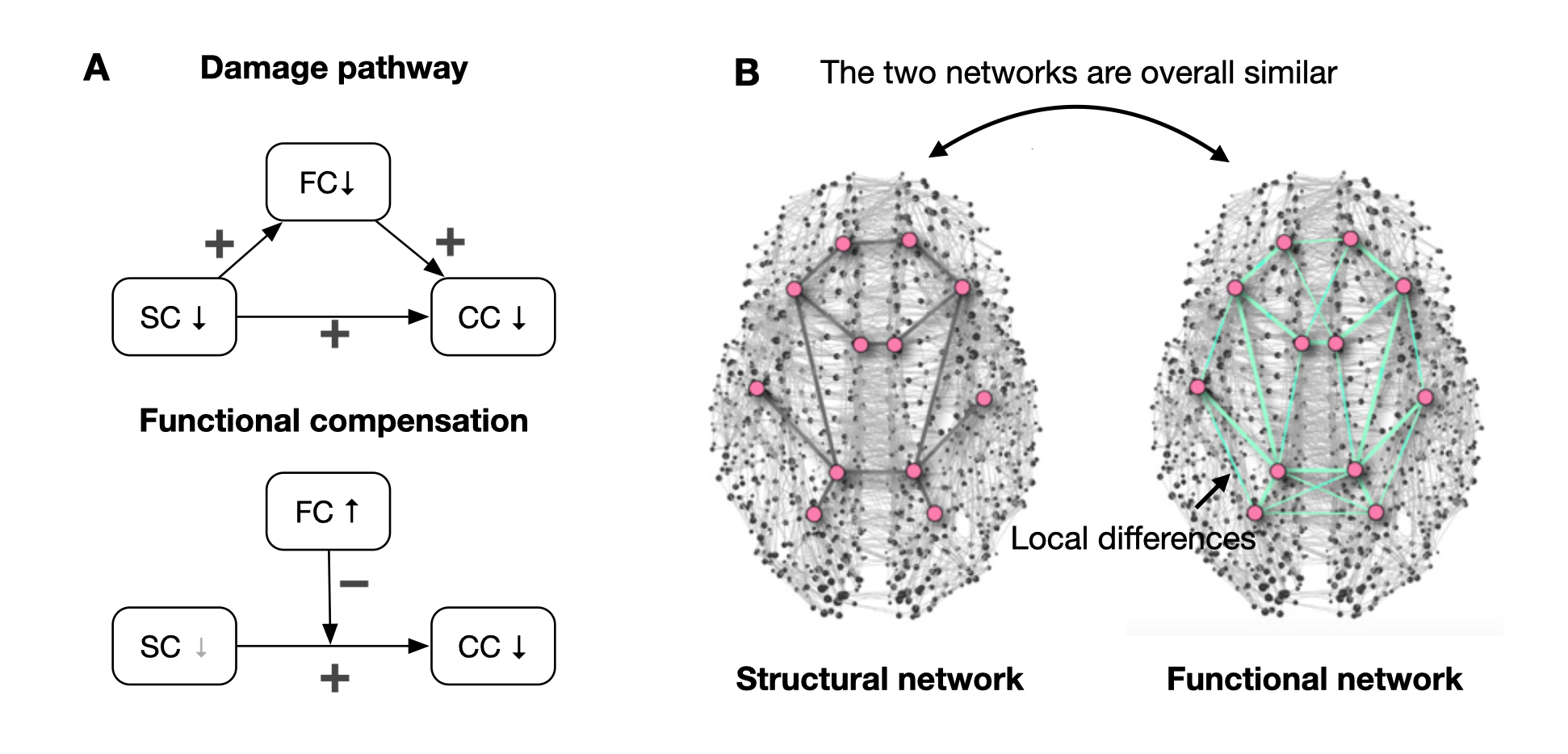 为了解释这一现象,研究引用了多模态网络研究中的经典发现:功能网络和结构网络在宏观水平相似,但在特定连接上存在差异(图2B)。对于老人而言,当结构网络损伤轻微时,功能连接能够依赖于第三方结构通路维持,并使得认知控制功能尽可能维持。然而,当结构网络损伤严重时,这种功能性维持将缺少物质基础,并使老人表现出认知控制衰退。