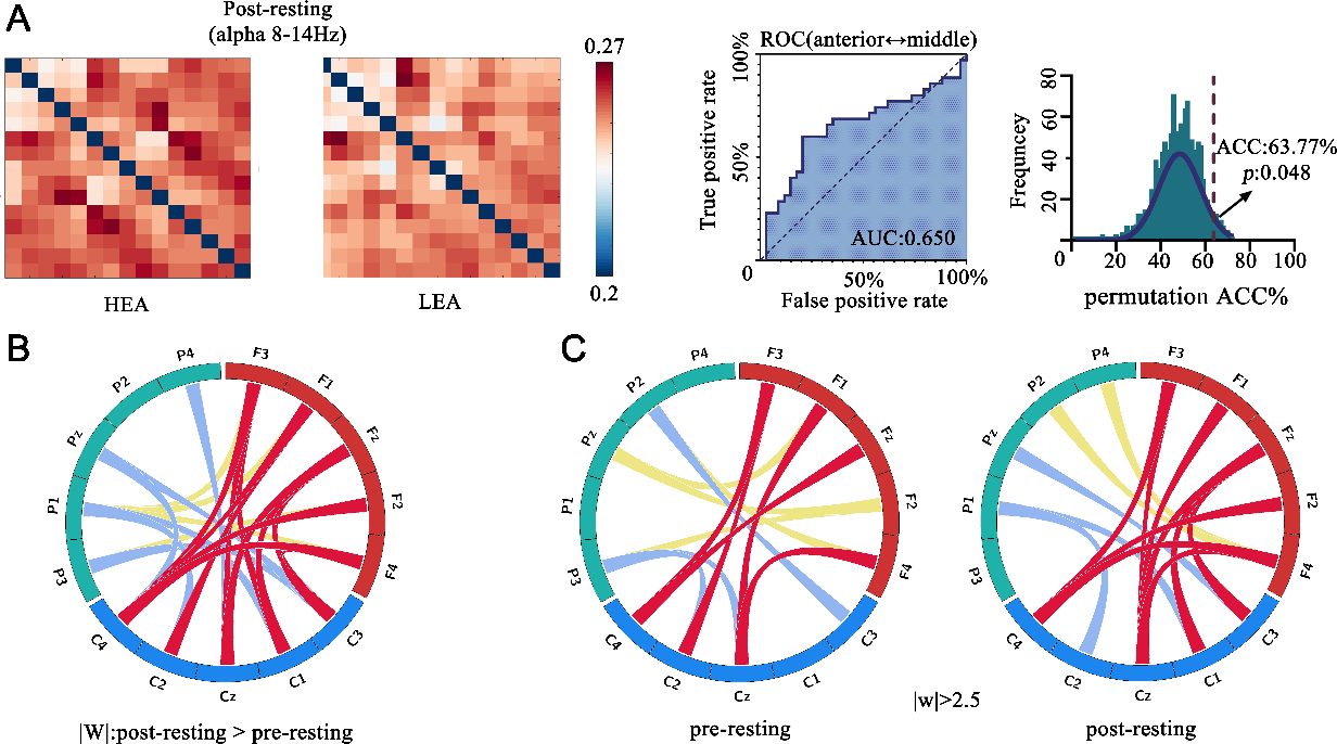 2)此外,静息态前额区alpha与中央区alpha之间的功能连接(phaselagindex,PLI)同样可以显著区分实验组与对照组被试(图2)。已有研究发现前额-顶叶网络参与几何类比问题解决(Preusse et al., 2011)。而且,顶-额整合理论(P-FIT)也强调顶叶和额叶区域的协作在流体智力中的重要性(Jung & Haier, 2007)。这进一步支持执行注意训练加强前额与顶叶同步性是后续类比推理表现提升的潜在机制。