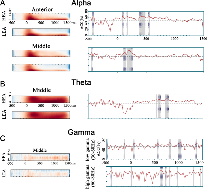 1)在接受执行注意训练之后,静息态前额区alpha以及中央区高频gamma功率谱密度均可显著区分实验组与对照组(图1)。已有研究一致地发现注意相关的训练会改变alpha活动(Knowles & Wells, 2018; Lomas et al., 2015),这提示alpha活动变化是考察执行注意训练有效性的一般性指标。高频gamma活动与空间注意有关(Wyart & Tallon-Baudry, 2008),考虑到本研究所采用的反眼跳训练需要被试进行空间(左右侧)注意转移,这提示高频gamma活动变化是考察执行注意训练有效性的任务特异性指标。
