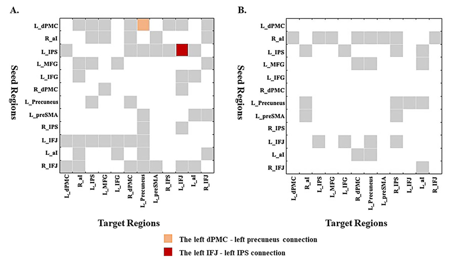 图1.分类支持向量模型的共识特征。连接矩阵中灰色部分代表建立分类模型过程中获得的共识特征。A. 54条整体水平共识特征。其中,老年人左背侧前运动皮层-左楔前叶连接明显弱于年轻人。在老年人中,左侧额下联合-左侧顶内沟连接与整体转换代价呈负相关。B. 28条局部水平共识特征。老年人和年轻人之间没有差异显著的特定连接,也没有与局部转换代价显著相关的连接。