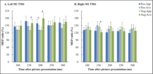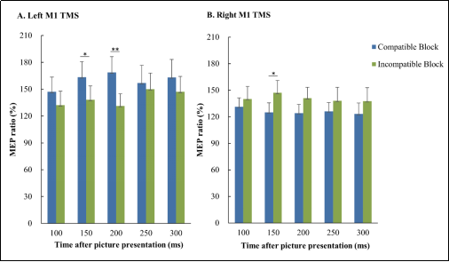 研究结果首先从行为水平上验证了基于自我认知的情绪性刺激反应兼容效应,即相容行为反应时显著快于不相容行为(如图一)。从电生理学水平上,揭示了左侧M1在情绪图片出现150 ms和200 ms时,消极回避的运动诱发电位(motor-evoked potential,MEP)振幅显著大于消极趋近任务;200 ms时,积极趋近的MEP振幅显著大于积极回避任务(如图二A)。此外,在150 ms和200 ms时,左侧M1在相容任务中的MEP振幅显著大于不相容任务(如图三A)。而在右侧M1中则有不同的发现。结果显示,右侧M1在情绪图片出现后150ms,消极回避的MEP振幅显著小于消极趋近任务(如图二B);并且相容任务的MEP振幅也显著小于不相容任务(如图三B)。